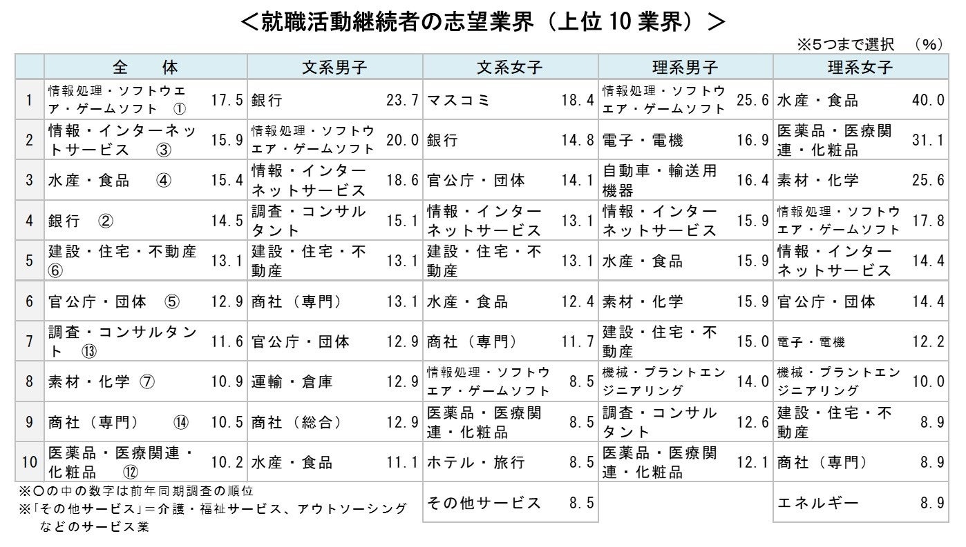 ○現時点の志望業界1位「情報処理・ソフトウエア」、2位「インターネットサービス」
