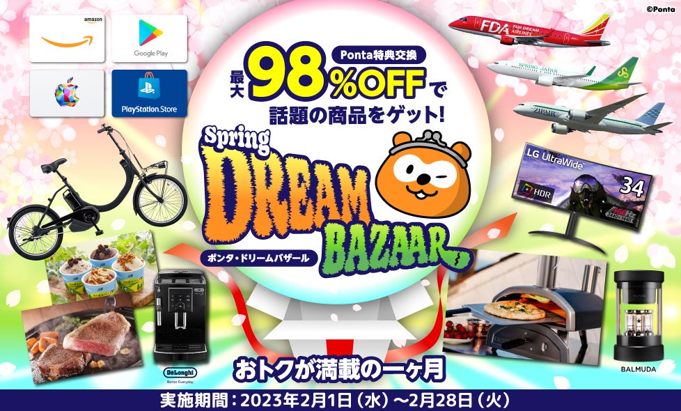 共通ポイントサービス「Ponta(ポンタ)」を運営する株式会社ロイヤリティ マーケティング(本社:東京都渋谷区、代表取締役社長:長谷川 剛、以下「LM」)は、2023年2月1日(水)~2月28日(火)、Pontaポイントを商品やポンタグッズと交換できる「Ponta特典交換」で、Spring Dream Bazaar(スプリングドリームバザール)を開催いたします。最大98%OFFで航空券や家電、グルメと交換できる権利の抽選企画や、最大50%OFFでデジタルコードやグルメなどと交換できるセールを実施します。