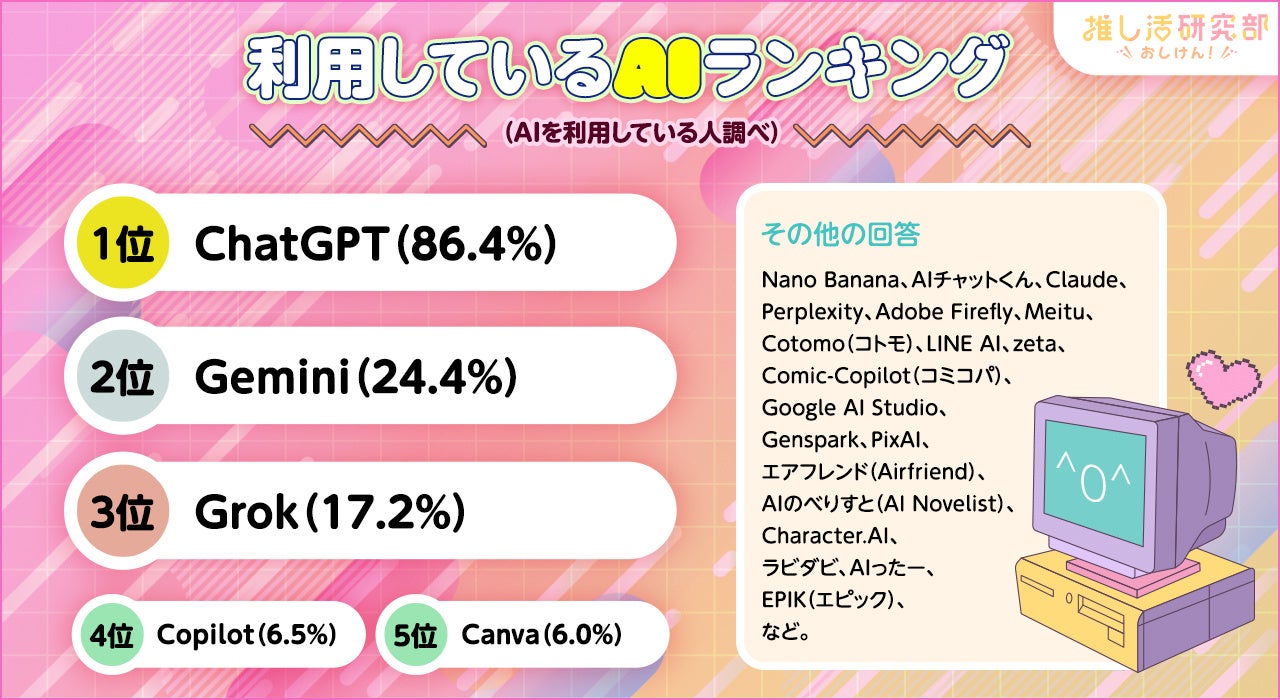 調査では、AIを普段から利用する推し活ユーザーの86.4%がChatGPTをよく利用すると回答し、2位のGemini(24.4%)を大きく引き離す結果となりました。