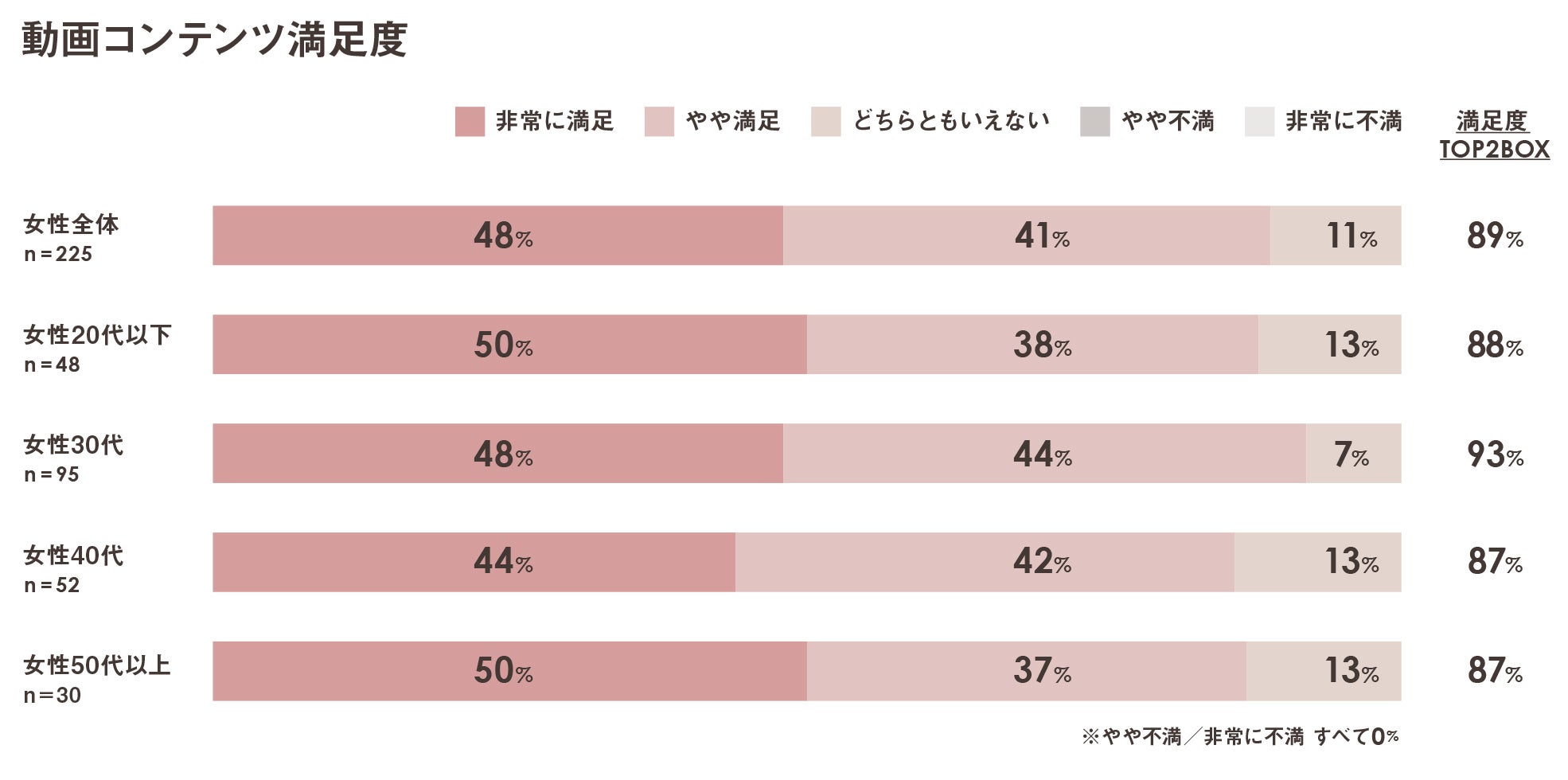女性の動画視聴者全体のコンテンツ満足度は89%。20代以下の満足度も高く、難病に対し社会の在り方を考えるコンテンツや病気の悩みに前向きになれるコンテンツへのニーズが高いことがわかった。