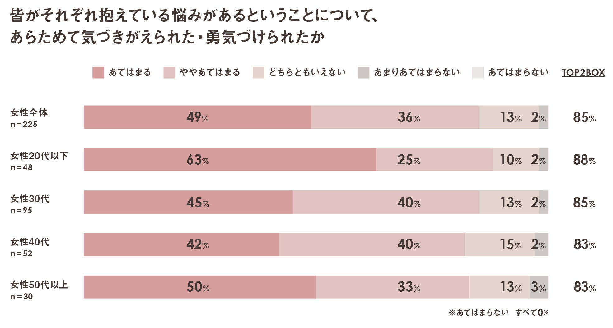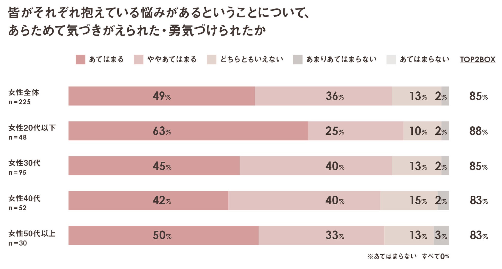 「皆それぞれ悩みがあることについて気づきが得られた・勇気づけられた」という回答が全体の85%。視聴者のポジティブなマインドセットに繋がる内容で共感を呼んだ。