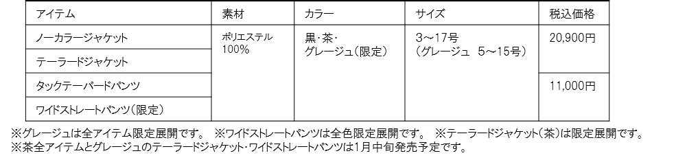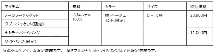 オールシーズン着用可能で、ビジネスシーンはもちろんオケージョンにも使える「きちんと感」のあるダブルクロス素材と、プライベートシーンまで着まわしできる、さらっとした肌触りが特長のトロピカル素材の2種類を展開。ジャケット2種類・パンツ2種類のカセット服で、セットアップでの着用はもちろん、単品使いもしやすく、働くシーンや気分に応じて「なりたい私になれる服」に仕上げました。もちろん、「洗える・防シワ・ストレッチ」といった働く女性が求める機能性を兼ね備えております。