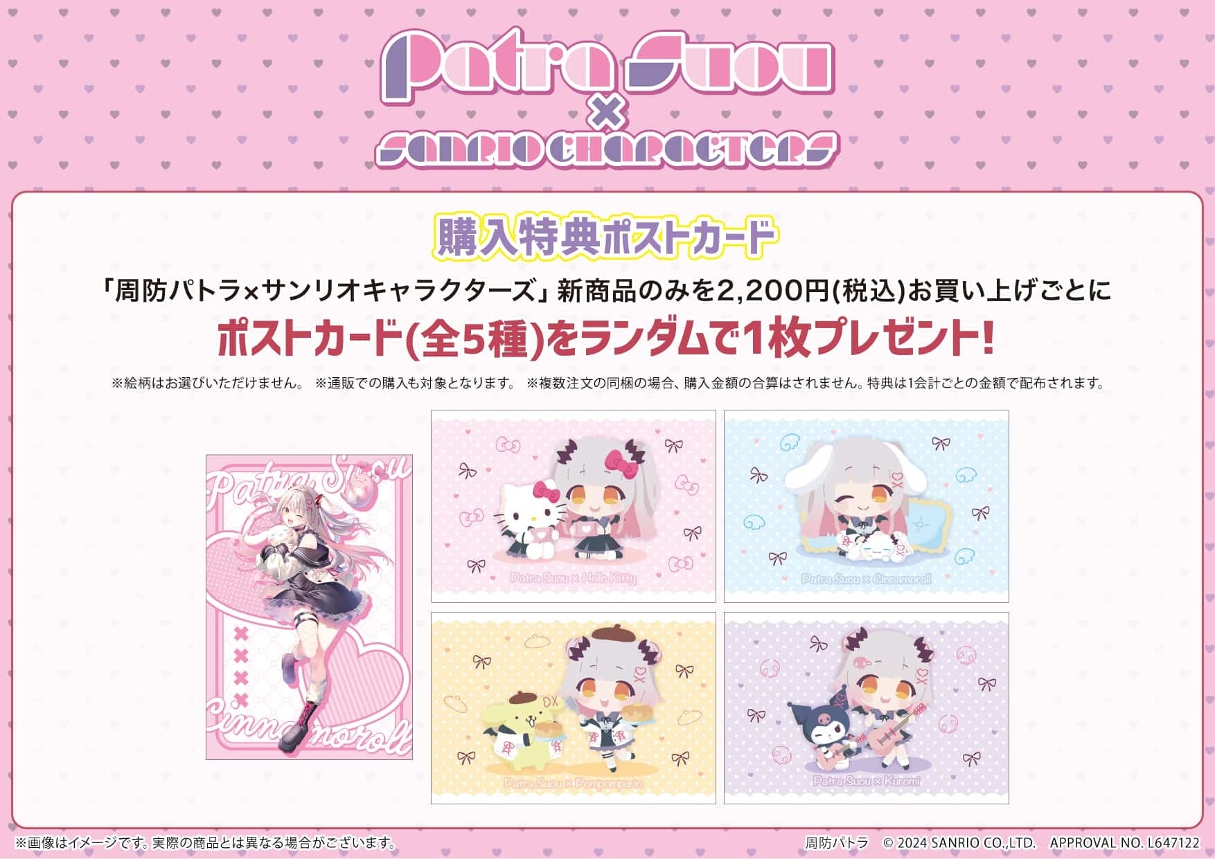 「周防パトラ×サンリオキャラクターズ」新商品のみを1会計2,200円(税込)お買い上げごとに、購入特典としてポストカード(全5種)をランダムで1枚プレゼント。