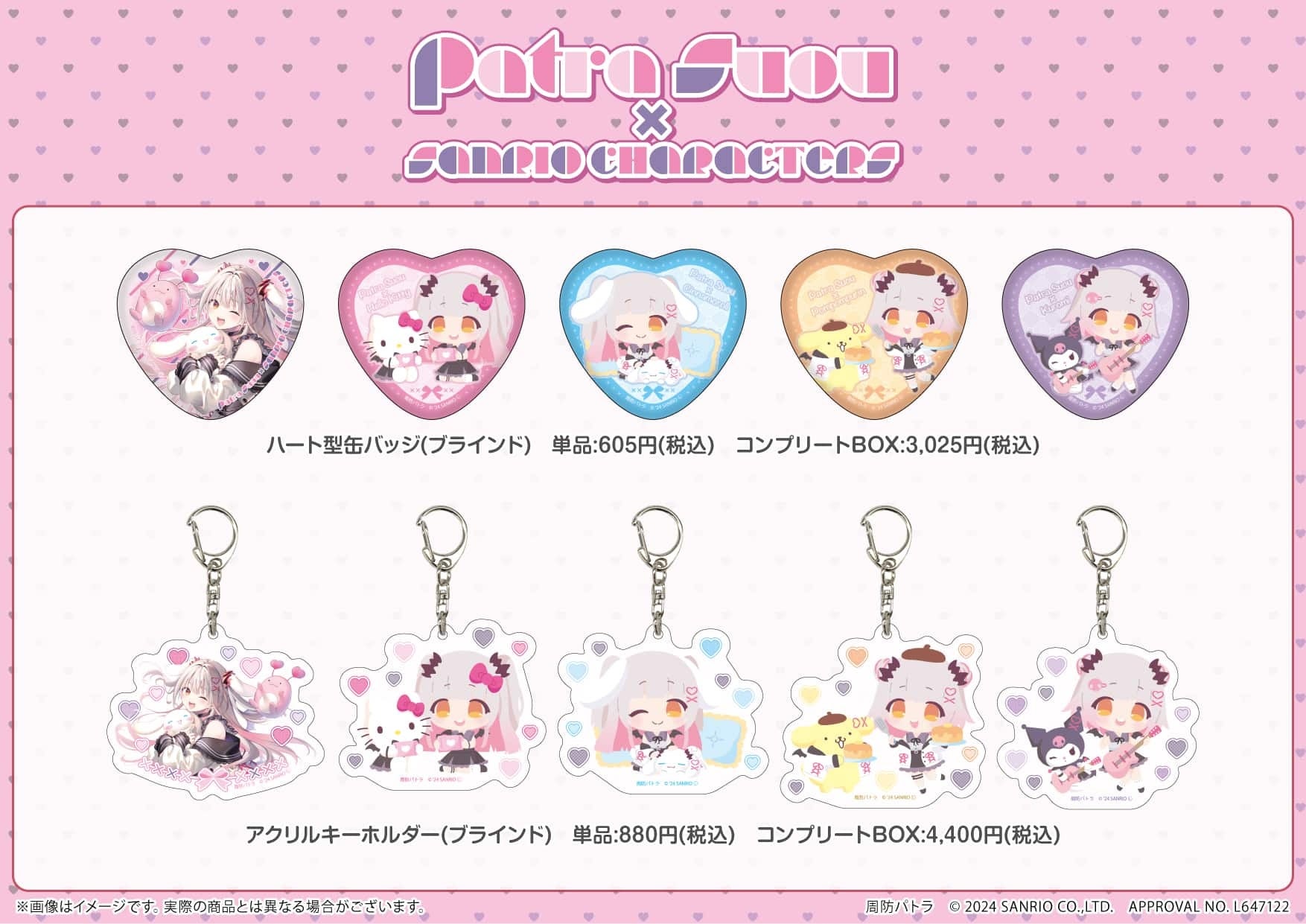 約5.7cm×5.3cmのハート型缶バッジと約6.5cmのアクリルキーホルダーは、どちらもパトラたちのお顔がよ~く見えるチャーミングなデザイン。ハローキティとゲームをしたりクロミとギターを弾いたり……どのペアも可愛すぎて胸キュンが止まりません!