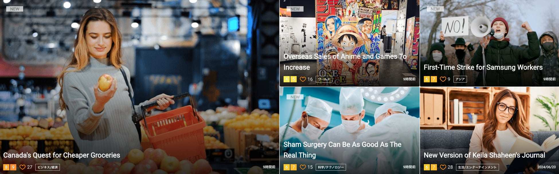 レベルは初級から上級まで幅広く、カテゴリーはビジネス/経済、科学/テクノロジー、生活/エンターテインメント、健康、スポーツ、アート、旅行、ワールド、アジアの計9つをご用意しており、豊富な種類の中から自身の関心に合った記事で英会話レッスンを受講することが可能です。