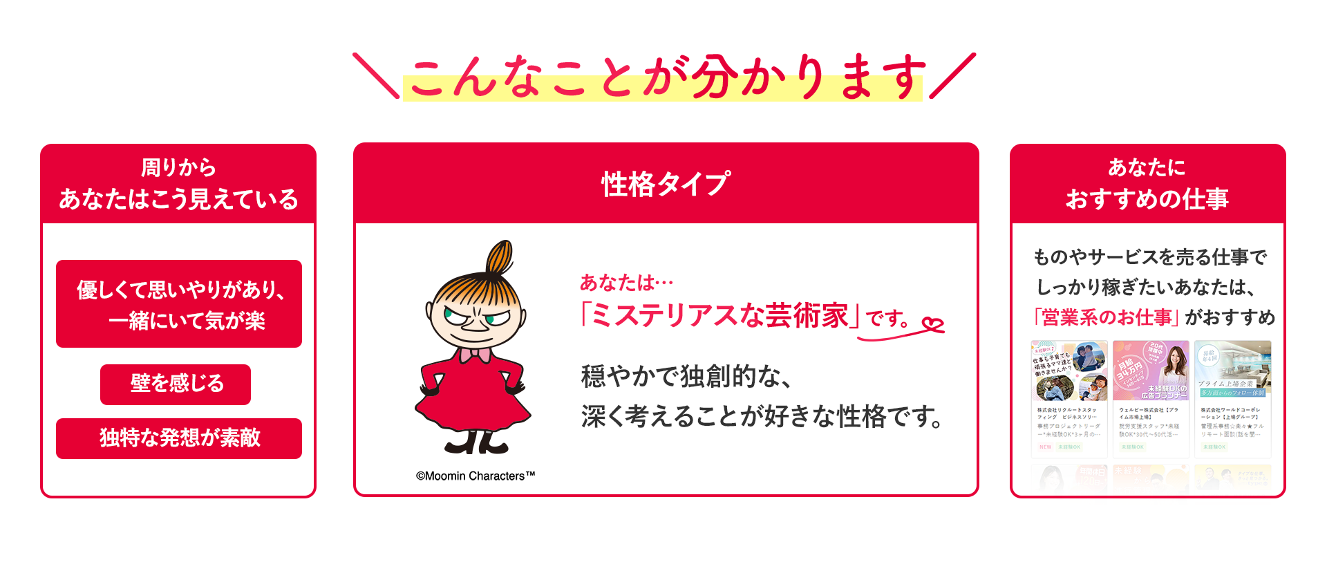 女の転職type独自のロジックを用いて性格タイプや、おすすめの職種、求人などを診断します。