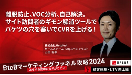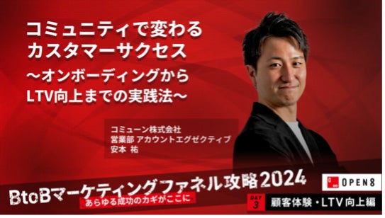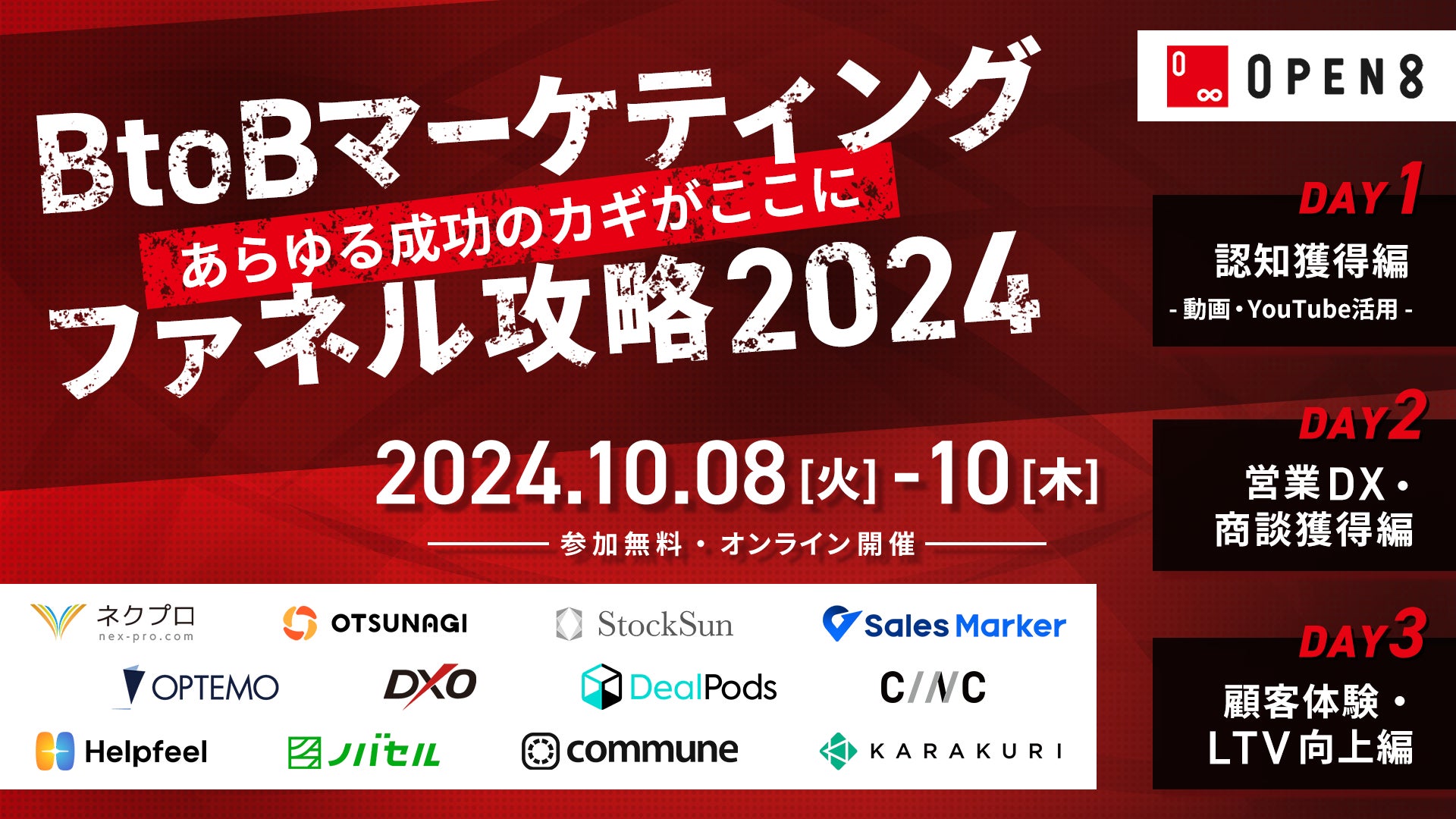 株式会社イノベーション(東証グロース 証券コード3970)のグループ会社である、株式会社Innovation & Co(本社:東京都渋谷区、代表取締役社長:齊藤和馬、以下「Innovation & Co」)は、株式会社オープンエイト(本社:東京都千代田区、代表取締役社長兼CEO:髙松雄康、以下オープンエイト)と共催で、2024年10月10日(木)に、『“あらゆる成功のカギがここに” B to Bマーケティングファネル攻略 Day3「顧客体験向上、CS、ファン化編」』をテーマとしたイベントを開催することをお知らせいたします。