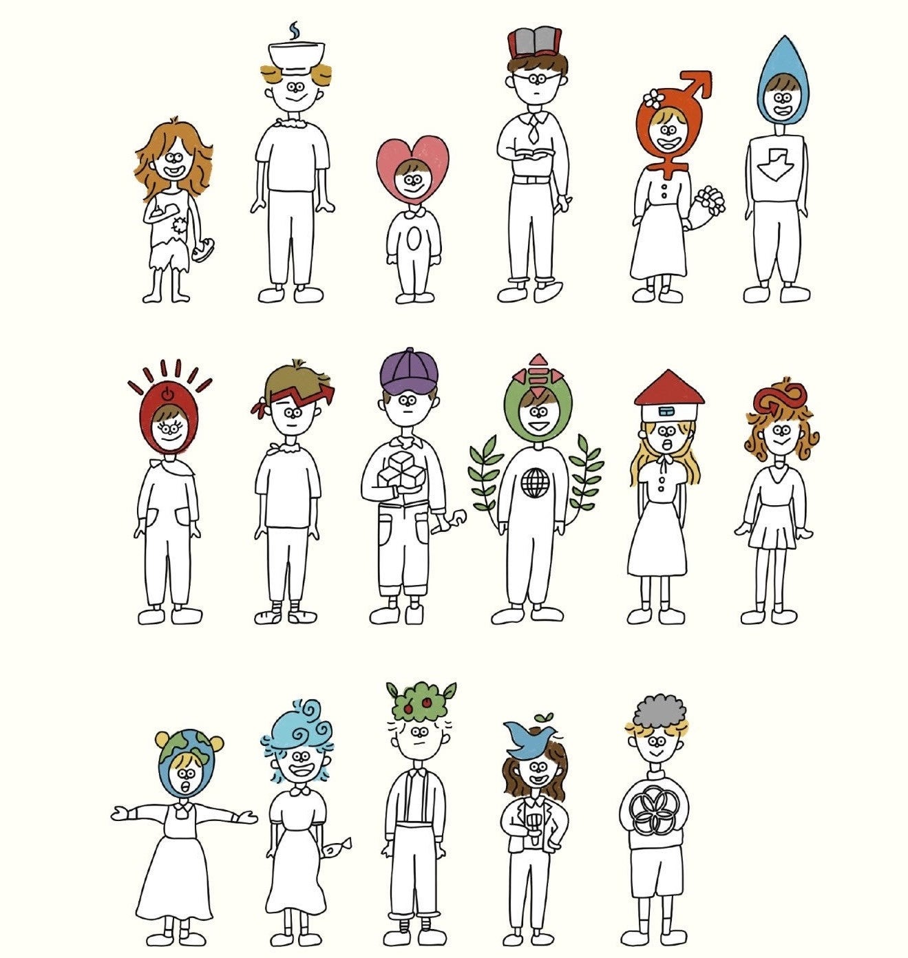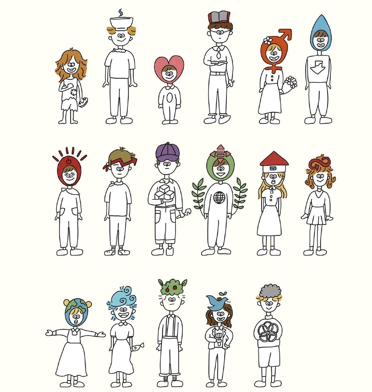 SDGsを達成するのは私たち人間の役目であるということを意識して、SDGsの17つの目標をキャラクターとしてイメージ化したデザインになっています。男女、子ども、関係なく一緒に生きる私たちが一緒に達成すべき目標であることを改めて覚えることができるように、多様な人間で表現されています。また、親しみやすいタッチの絵になっていることから、SDGsをよく知らない人にも関心を持ってもらいたいという気持ちが込められています。