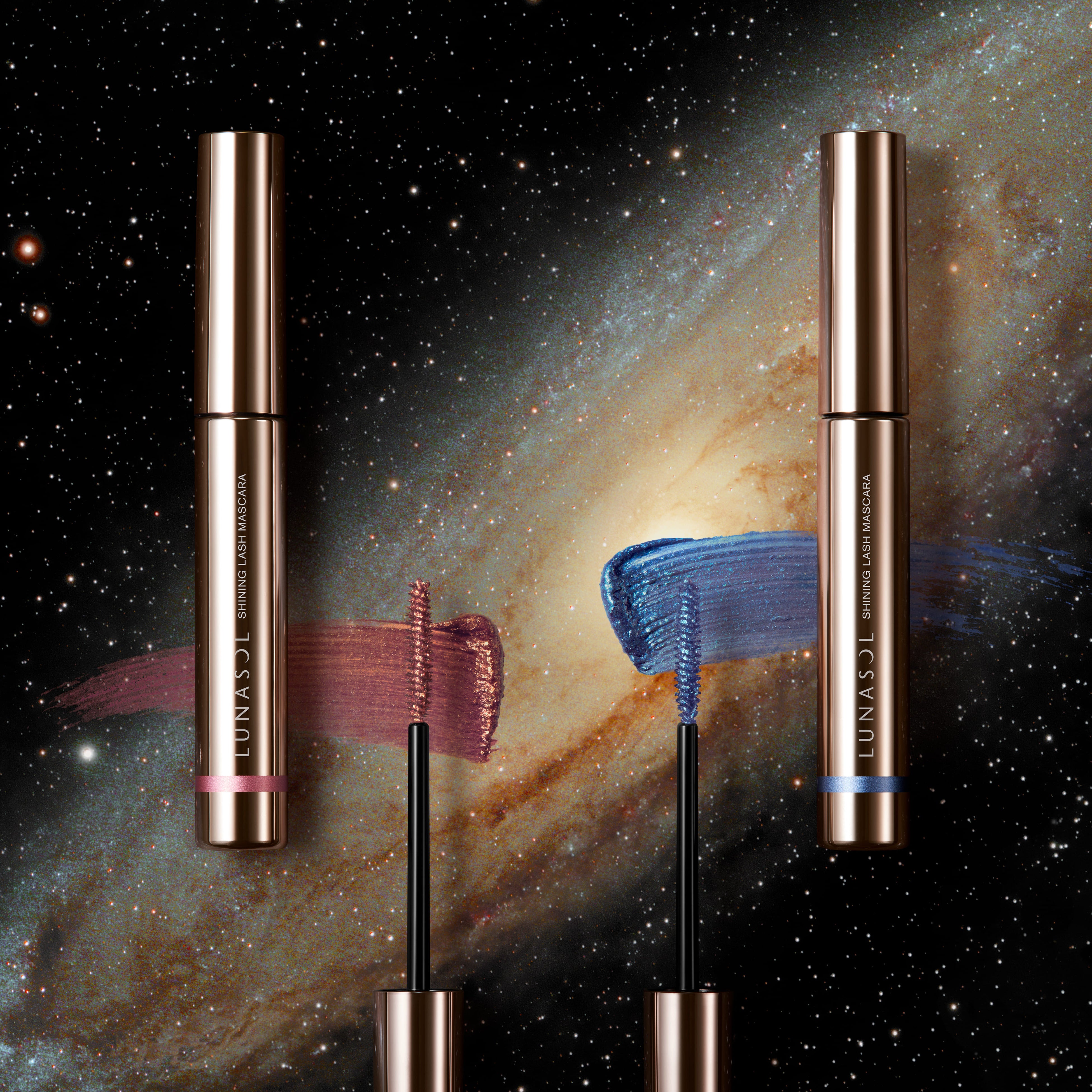 星雲や銀河の混じり合う色と輝きをイメージして、ドラマティックな目もとを演出する4色アイシャドウ「ルナソル アイカラーレーション」の新色2種(うち限定1種)のほか、マスカラやリップスティック、ネイルポリッシュなどを展開。星雲の溶け合うような色や輝きを表現した「Lyrics of Nebula」と、銀河の輝きを思わせる「Galaxy Flash」の2ルックを提案いたします。