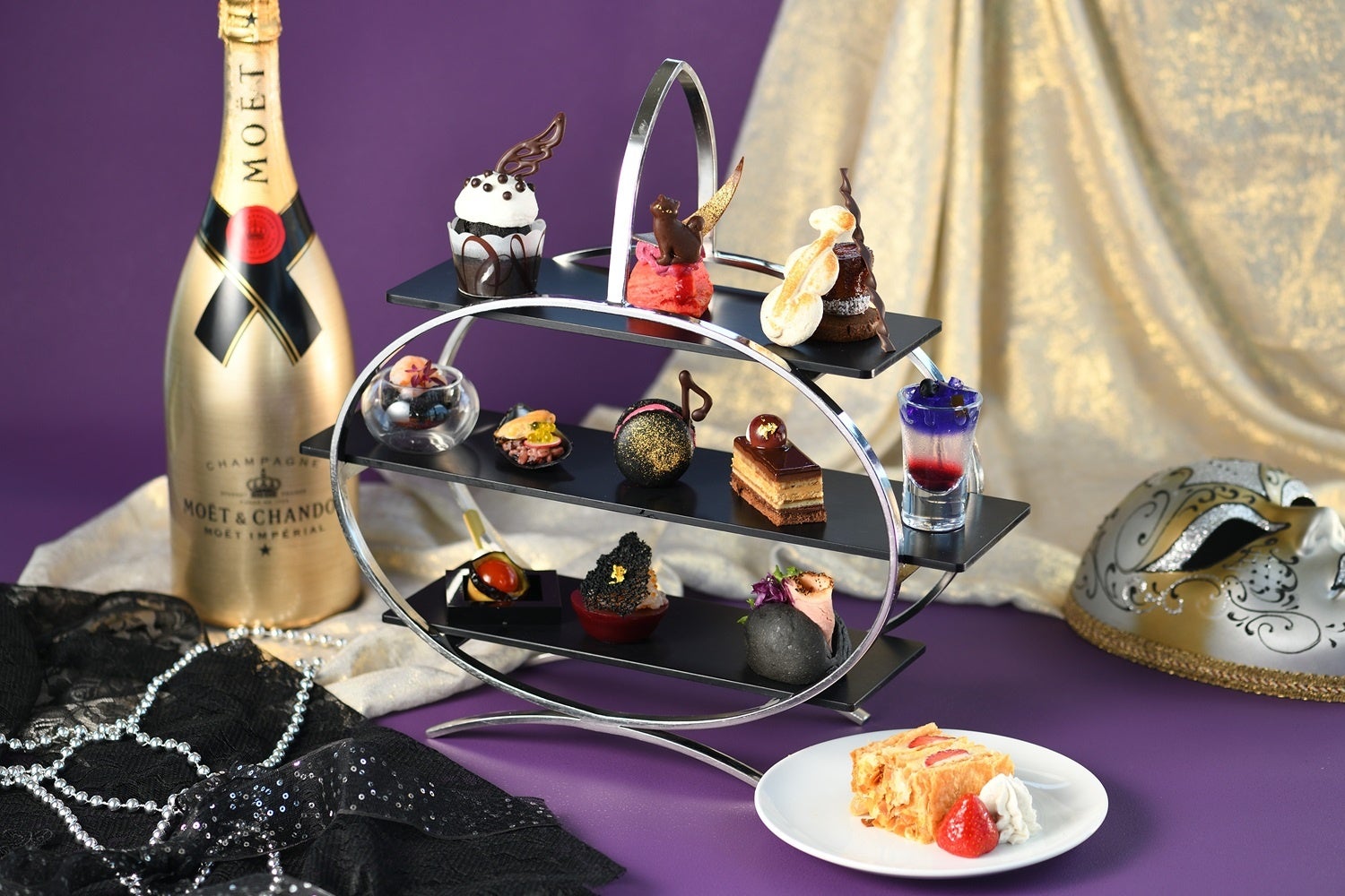 煌びやかなドレスや仮面が舞う幻想的な舞踏会の情景をモチーフに、思わず写真に収めたくなるようなビジュアルのスイーツたちがティースタンドを華やかに彩ります。