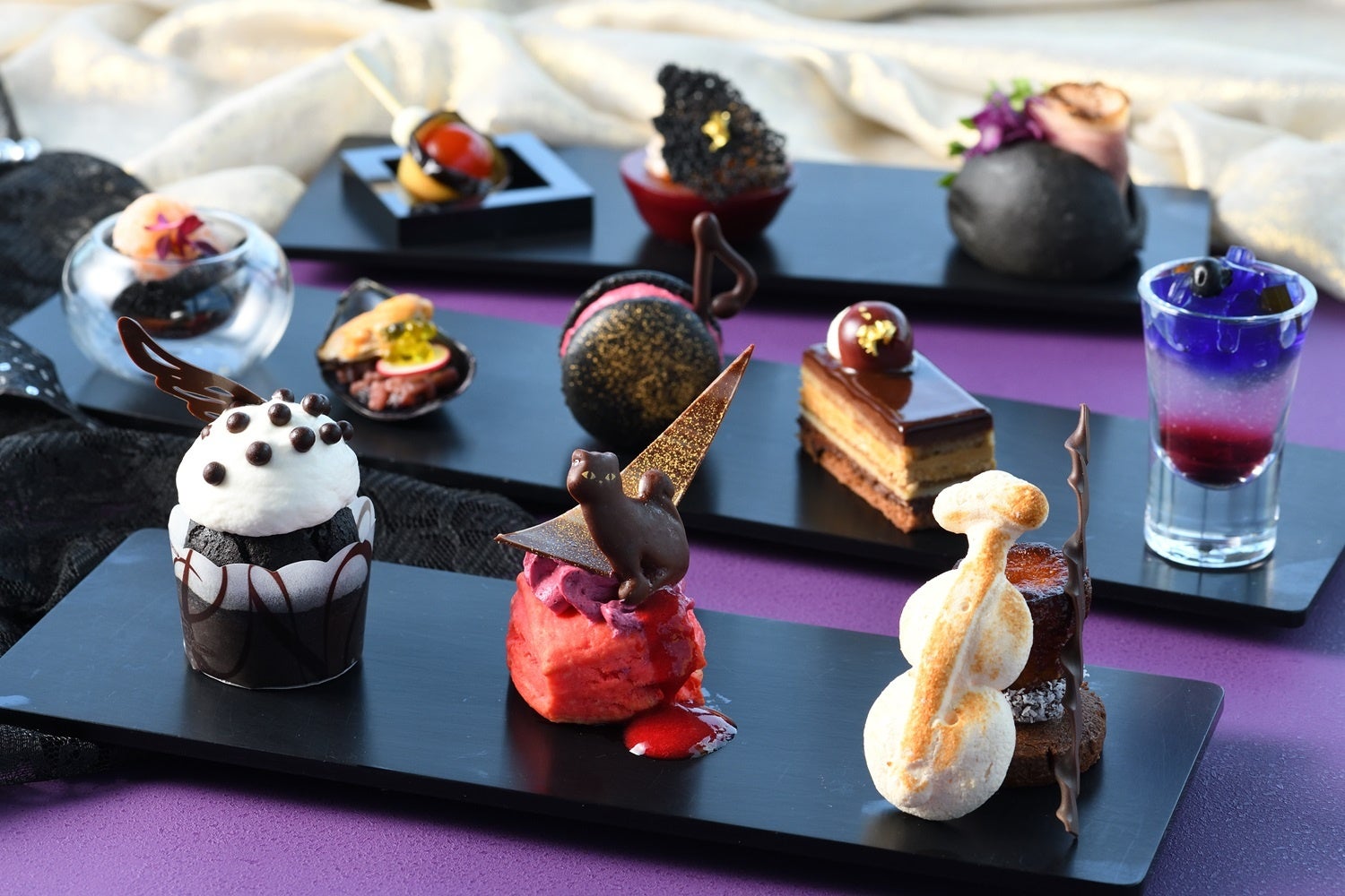 スイーツとセイボリーのラインナップには、ラズベリーが香る「月夜と黒猫のラズベリースコーン」、舞踏会のアイテムに欠かせないアイテムを詰め込んだ「ハットに見立てたカヌレとバイオリンのメレンゲ」や「カシスの"音符マカロンサンド"」など、舞踏会を彩るようなスイーツが勢ぞろい。可愛らしさの中にシックなムードが漂います。さらに、「海老とイカ墨のコンキリエ」や「鴨のパストラミの竹炭サンド」など、夜をイメージしたセイボリーもご用意。スイーツとのバランスをとり、見た目も味わいもお楽しみいただける内容になっています。