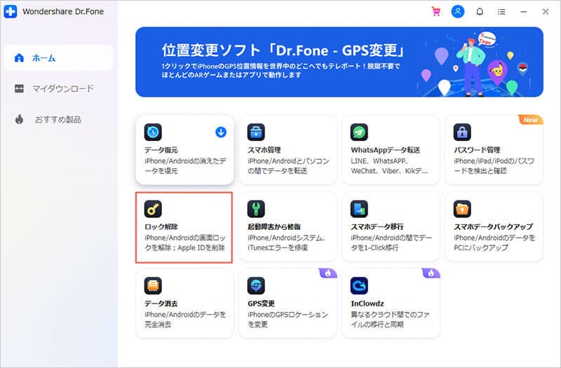 1.Dr.Foneを起動し、「ロック解除」を選択