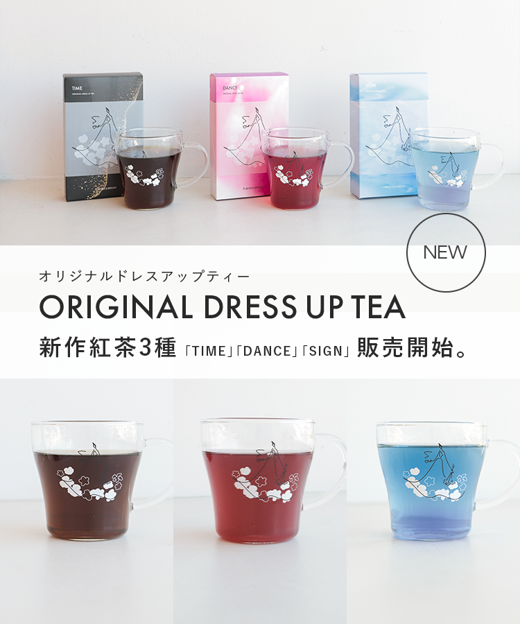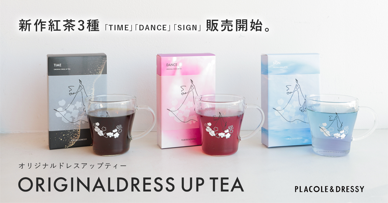 『個性が煌めく魔法の言葉』 "100人の人生に100通りに煌めく魔法をかける"をテーマに創設された古都鎌倉発のラグジュアリーブランド、PLACOLE&DRESSY(プラコレ&ドレシー)がプロデュースするカフェ&バー、『お花とドレスと紅茶のお店 DRESSY ROOM&Tea』と名古屋駅直結KITTE名古屋3Fウェディングのテーマパークカフェ『DRESSY CAFE -きらめく魔法にかかる空間-』の2店舗と専用ECサイト『DRESSYONLINE』にて販売しているオリジナルブレンドティーと農薬不使用のエディブルフラワー(食用花)のセットに新作紅茶「DANCE-ダンス-』『SIGN-サイン』『TIME-タイム-』が仲間入り!1から独自で調合したオリジナルブレンドは、香り高く、華やかなカラーが特徴的です。 それぞれのフレーバーに込められたメッセージと、色鮮やかな花のパッケージは、特別な瞬間を彩るためのギフトにもぴったり。 是非おうちで、PLACOLE&DRESSYがつくる自慢の紅茶をお楽しみください。