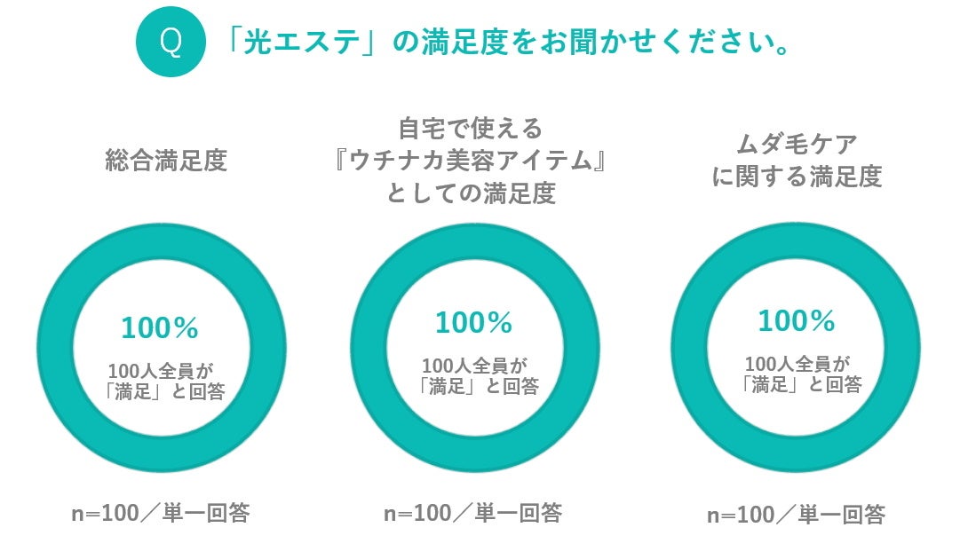 モニター調査の結果、「光美容器 光エステ<ボディ&フェイス用>ES-WP98(以下、「光エステ」)」を使用した満足度は100%(モニター100人中、100人全員が「満足」と回答)という結果に。また、「自宅で使える『ウチナカ美容アイテム』としての満足度」、「ムダ毛ケアに関する満足度」についても、100人全員が「満足」と答えるほどの高評価となりました。