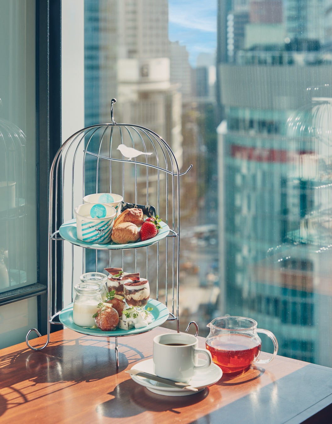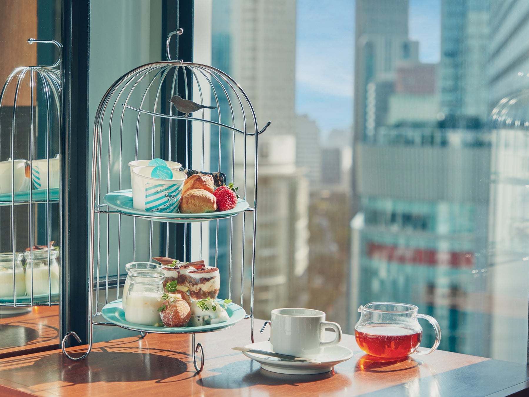 大阪梅田の高層階から臨む絶景と共に楽しむ季節のアフタヌーンティーセット。