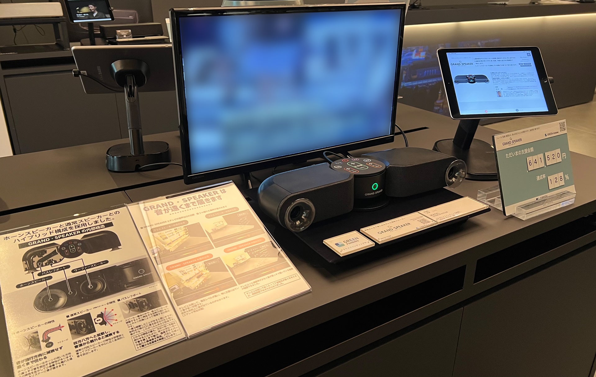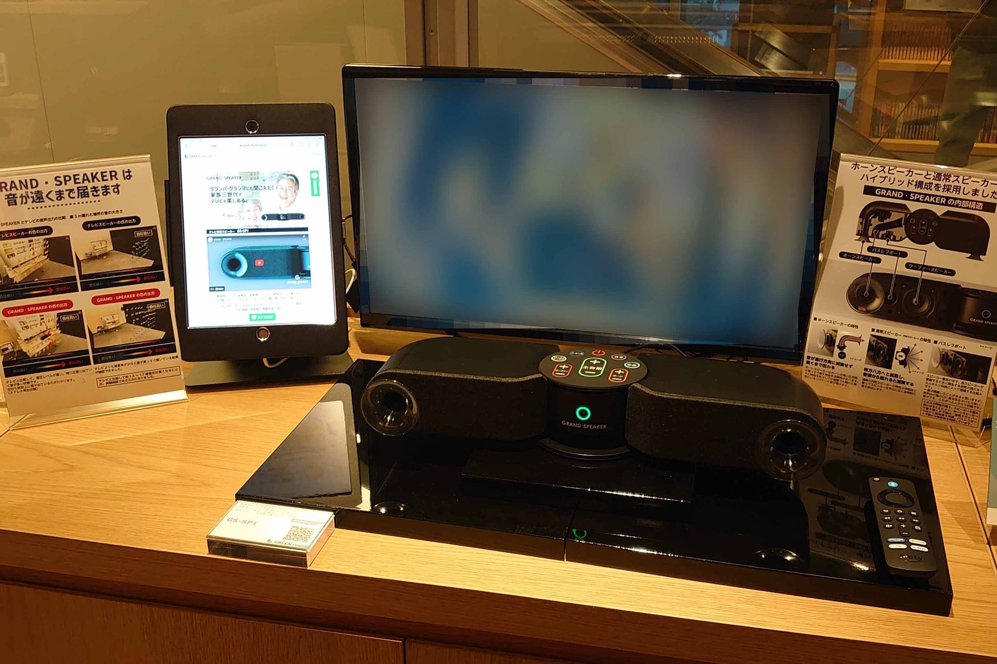 「GRAND・SPEAKER(グランスピーカー) GS-SP1」は、聞き取りやすいテレビ専用スピーカーでありながら、音楽番組や映画を迫力ある音質で楽しめる製品です。現在、GREEN FUNDINGにてプロジェクトを実施中で、音質や質感をご体験いただける先行展示を「蔦屋家電+」「SHIBUYA TSUTAYA 4F TOUCH&TRYブース」にて開始しました。