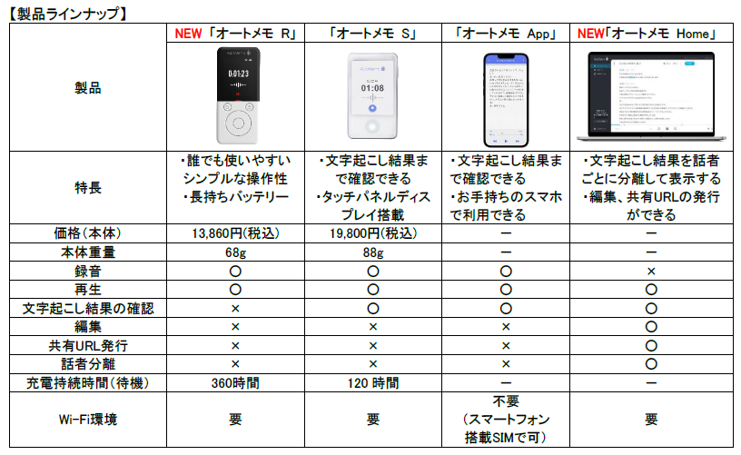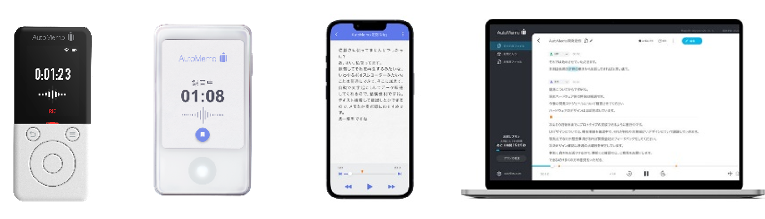 「オートメモ」では、OpenAI社の音声認識エンジン「Whisper」を一部で採用するなど、最適なエンジンを実装することで高い文字起こしを実現しています。2020年12月より販売を開始し、2021年12月にはディスプレイ付き端末「オートメモ S」を発売。2023年8月1日にはテキスト化したデータを編集ができる専用webアプリ「オートメモ Home」をリリースしました。さらにオートメモの文字起こしAIボイスレコーダーはブランド別累計販売台数・金額シェアNo.1(注1)を誇っています。