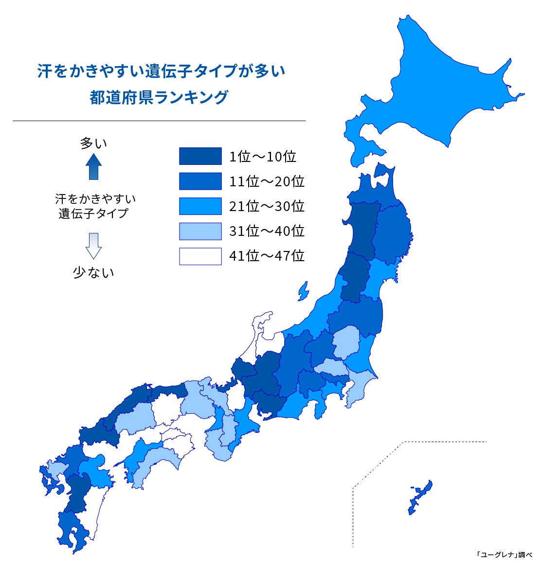 株式会社ユーグレナ(本社:東京都港区、代表取締役社長:出雲充)は、夏本番を前に、熱中症と密接な関係がある汗に注目し、ユーグレナ・マイヘルスとジーンクエストの遺伝子解析サービスのゲノムデータをもとにした「汗をかきやすい遺伝子タイプが多い都道府県※1ランキング」を公開します。