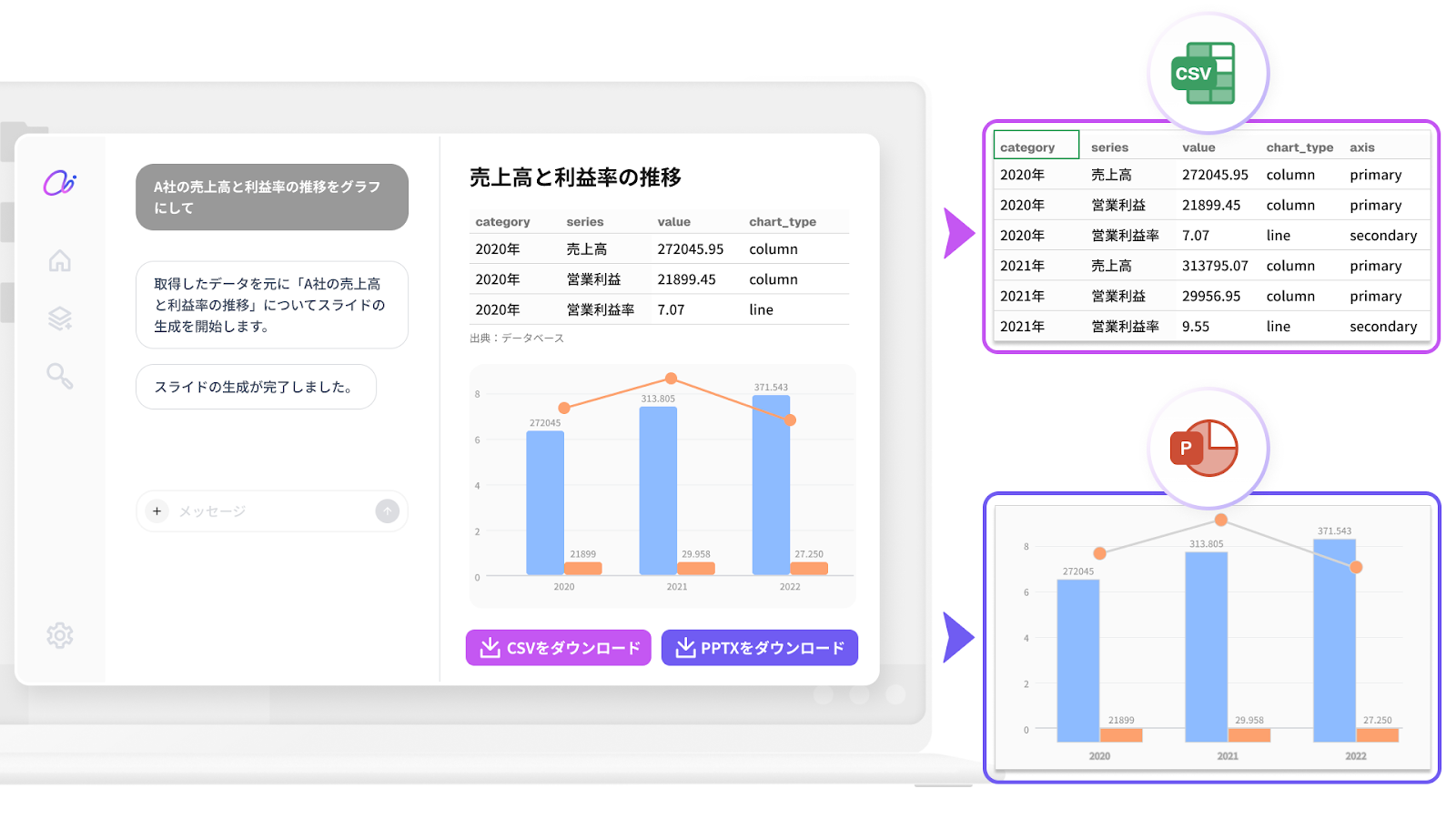 AIエージェントがユーザーの依頼を理解し、エージェントデータ基盤から最新の取引実績や外部データベース等から情報を自律的に取得します。エージェントは特定のデータソースだけを参照することでハルシネーションを防ぎ、最新かつ正確なデータに基づいた精緻な提案書を自動生成します。取得したデータは、AIエージェントとの対話形式で修正できるほか、CSV形式での書き出しや、PowerPoint内のExcelデータの直接編集にも対応しています。