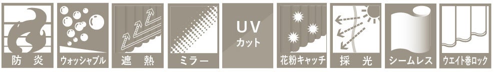 「どれを選べばいいかわからない」「機能も見た目も、全部あきらめたくない」という声に応える、万能な「超多機能」シリーズです。防炎・ウォッシャブル・遮熱・ミラー・UVカット・花粉キャッチ・採光・シームレス・ウェイト巻ロックの9つの機能を1枚に凝縮しました。