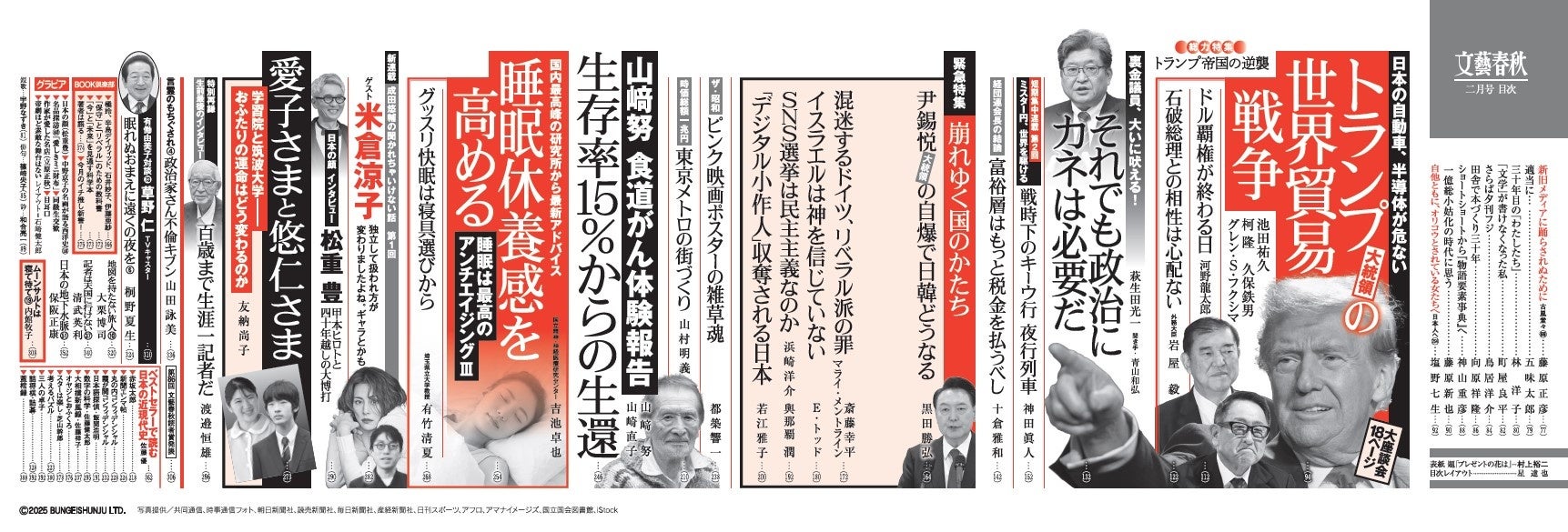 『文藝春秋』二月号、本日発売!「総力特集 トランプ帝国の逆襲」「山﨑努 食道がん体験報告」「渡邉恒雄 生前最後のインタビュー」「成田悠輔 新連載 ゲスト米倉涼子」「日本の顔 松重豊」など、話題が満載!