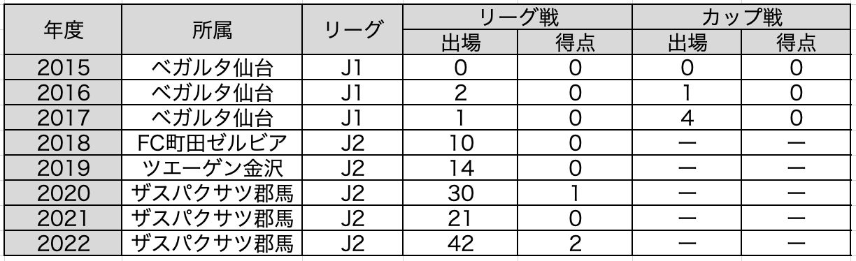 行田ペガサスサッカースポーツ少年団-クマガヤサッカースポーツクラブ-ベガルタ仙台ユース-ベガルタ仙台-FC町田ゼルビア(期限付き移籍) - ベガルタ仙台 - ツエーゲン金沢(期限付き移籍) - ベガルタ仙台 - ザスパクサツ群馬