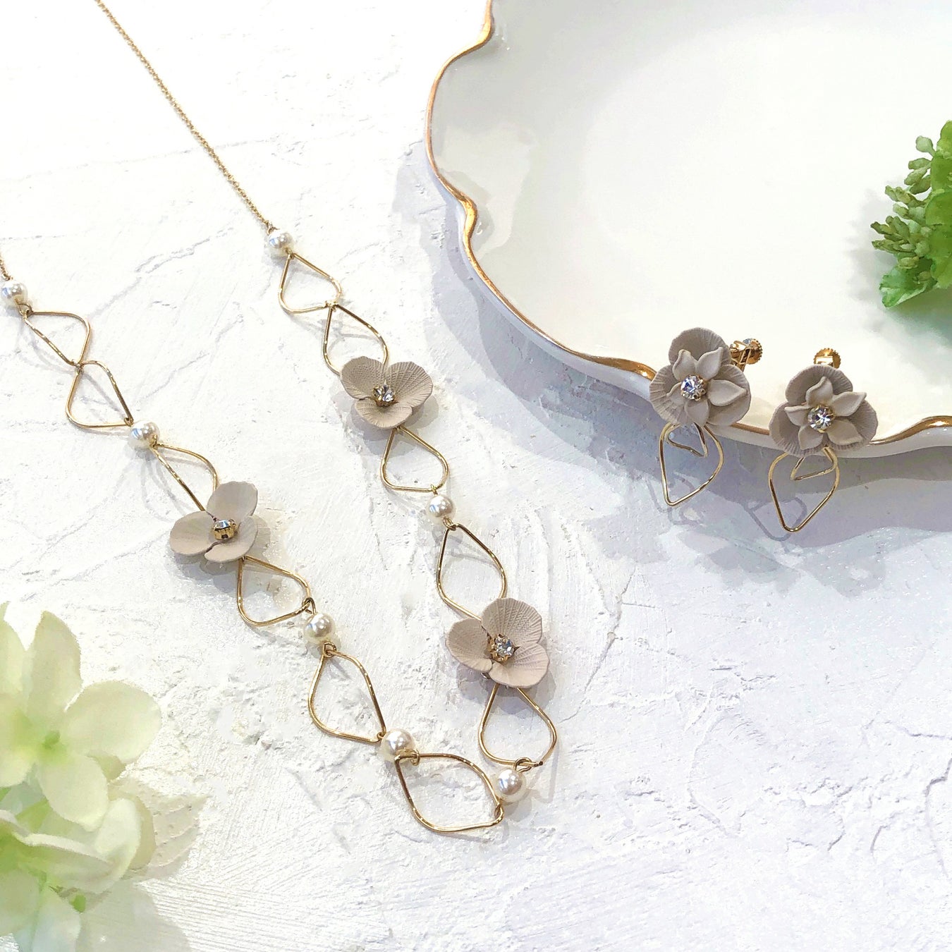 座金にフラワーパーツを編みつけ、フープと繋げたネックレスです♪