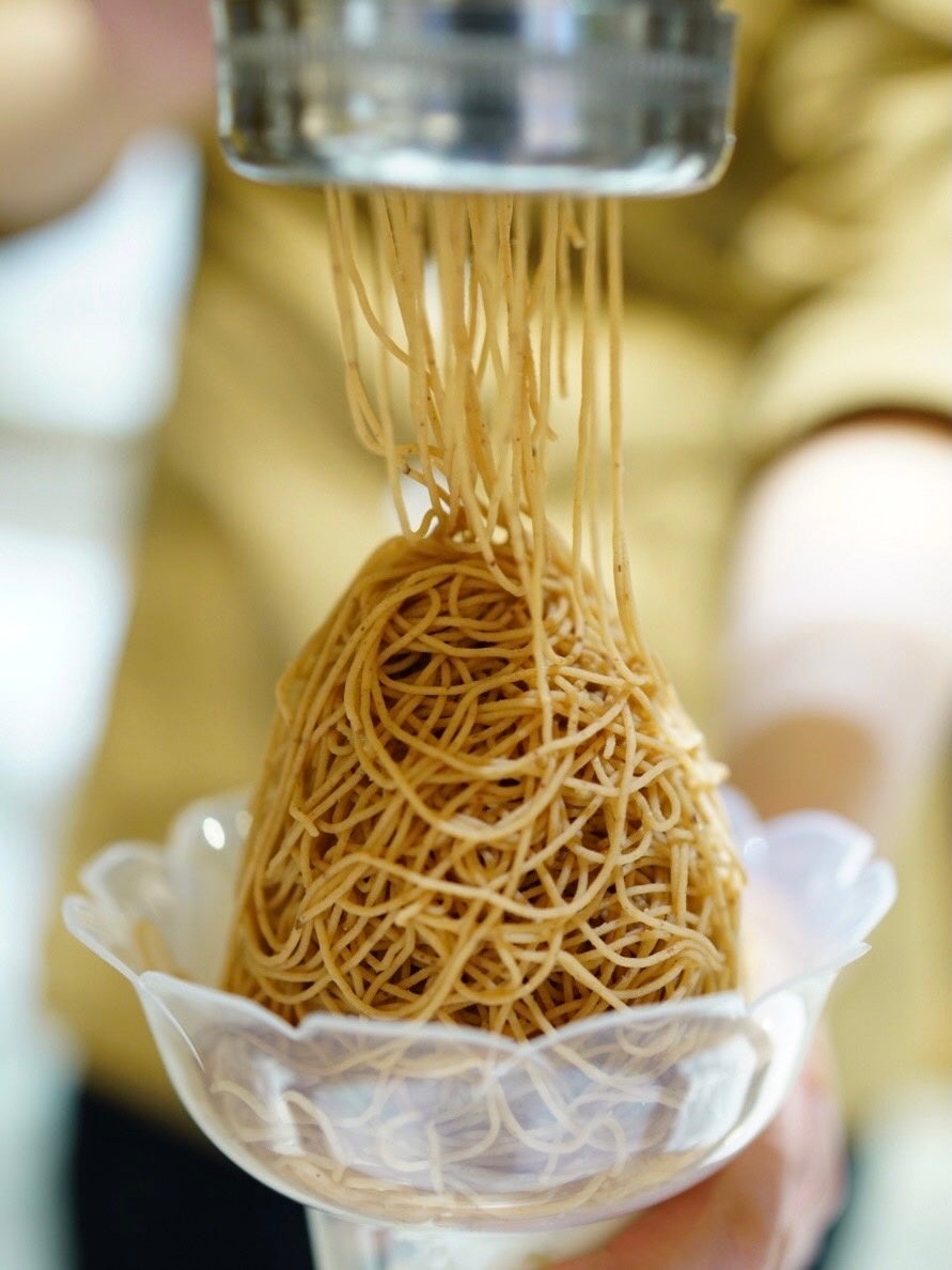 - ⽬の前でひとつずつ仕上げるモンブランパフォーマンスが話題の【⽣搾りモンブラン専⾨店】