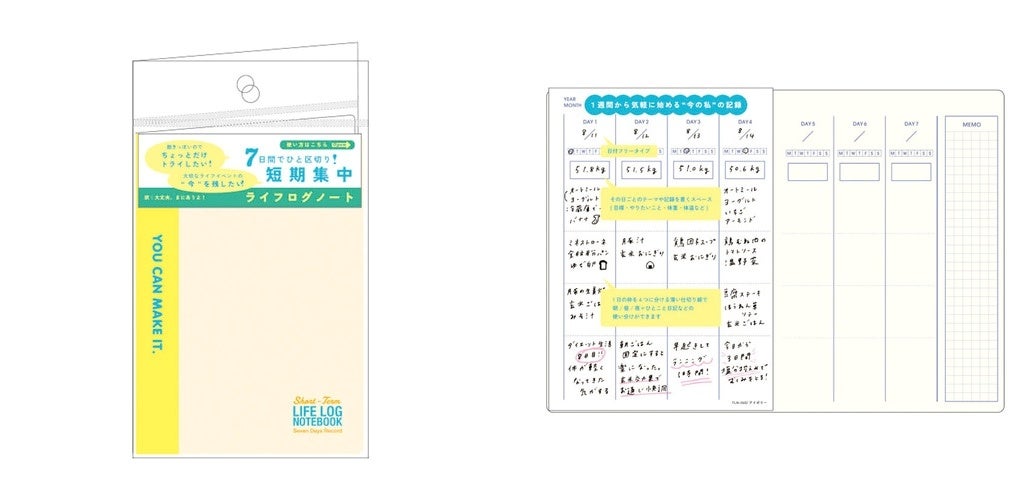 1週間から取り組める短期集中型ライフログノート。ライフイベントなどの“今”を集中的に記録して、思い出や覚え書きとして残したり、モチベーションをアップしたいときに見返して過去の頑張りを振り返ることでやる気につながります。仕様も軽量コンパクトな手のひらサイズとプチプライスで気軽にライフログに挑戦できます。