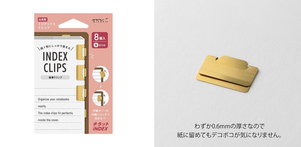 紙1枚にしっかりと留まるクリップタイプのインデックス。0.15mmの真鍮を採用し、手帳カバーからはみ出さないインデックスのサイズが特徴です。クリップを付けたときのページのふくらみを最小限に抑え、手帳に書きこむ際にも邪魔になりません。取り外しが自由にできるクリップのため、何度も使えて位置の移動も簡単です。手帳をスマートに持ち歩きたい方におすすめの手帳カスタマイズアイテムです。