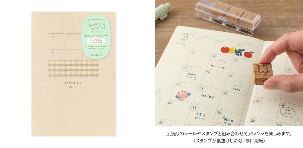 誰でもかんたんに「ゆるく楽しく」日々の記録が続けやすい月間フリーダイアリー&方眼罫ノートです。お好みでノートとカバー、シールやスタンプを選んで組み合わせることで、書くのも見返すのも楽しい、あなただけの彩り豊かなノートが完成します。裏抜けやにじみがしにくい厚口の「MD用紙」を使用した、スタンプ アレンジにぴったりのノートです。