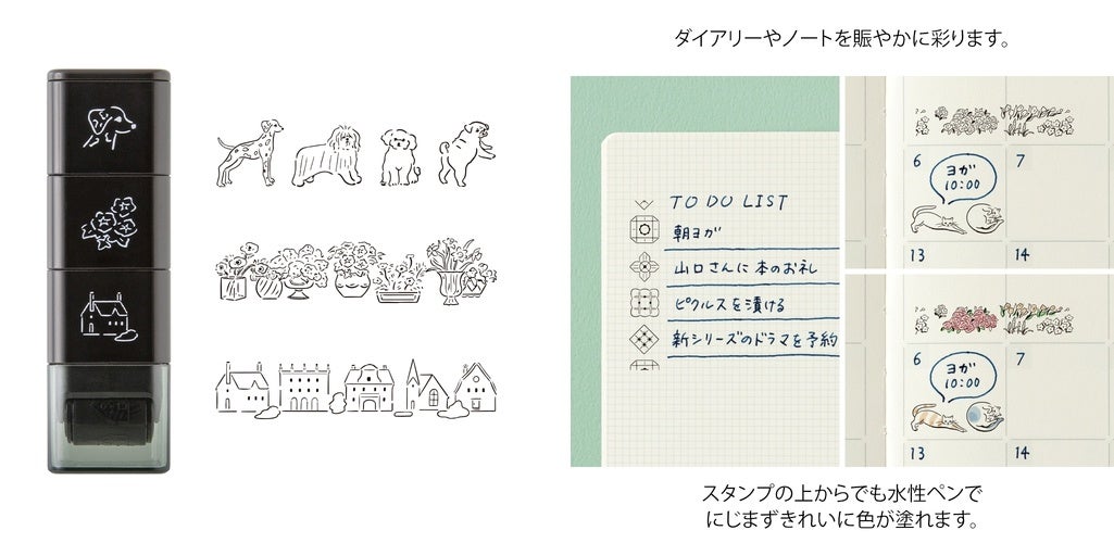 ノートやダイアリーの記録を楽しむためのローラータイプのスタンプ。ペンケースにも入るサイズ感で、3種類のスタンプが連結しています。これ1つで3つの繊細な柄をきれいに押すことができ、ページにできた余白を賑やかに彩ります。インキは油性顔料のため、押した絵柄の上から水性マーカーで色を塗ってもにじみません。