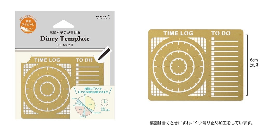 お気に入りのペンでなぞるだけで、手帳やノートに記録や予定が書ける真鍮製のテンプレート。3つの大きさの異なる円が作れるので、時間のグラフで日々の行動を記録できます。12時間や24時間の時間単位での記録やスケジュールをまとめられるほか、テンプレートの右側を使うと、ToDoリストやバーチカルのフォーマットが作成できます。書くときにずれにくいよう、裏面には滑り止め加工を施しています。