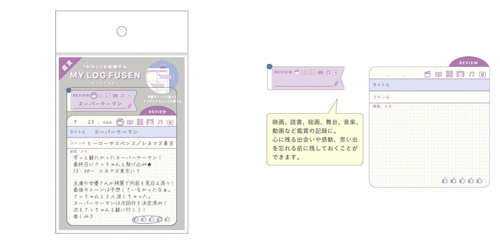 日々の体験や出来事、響いたシーンやその瞬間の感情など、何気ない日々の「わたし」を記録する付箋です。フラッグ型の小さな付箋はその日に起きた内容を書いてマンスリーページに貼って使ったり、インデックスとして使うこともできます。ましかくの付箋は文章として記録でき、写真やショップカード、チケットなどと合わせて手帳やノートに貼ることができ、ライフログにピッタリです。栞としても便利なインデックス付きです。