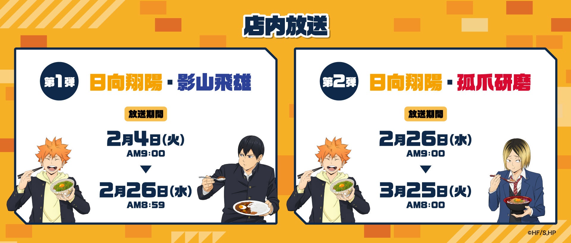 キャンペーン期間中、店舗にてキャラクターたちによる店内放送を聞くことができます。放送内容は第1弾・第2弾に分かれ、日向(ひなた) 翔陽(しょうよう)、影山(かげやま) 飛雄(とびお)、孤爪(こづめ) 研磨(けんま)がキャンペーンの内容をご紹介します。