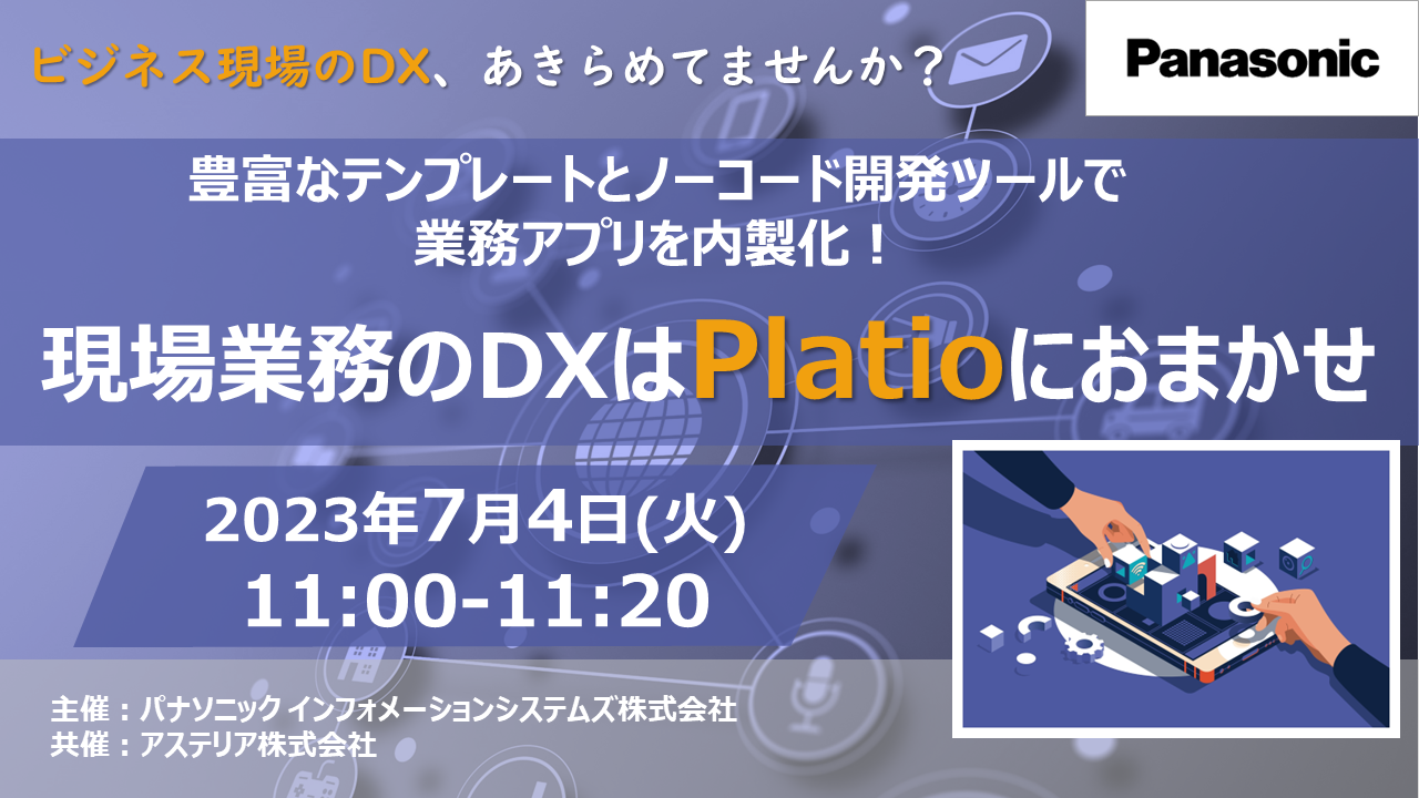 パナソニック インフォメーションシステムズ株式会社は2023年7月4日(火)『ビジネス現場のDX、あきらめてませんか? 豊富なテンプレートとノーコード開発ツールで業務アプリを内製化!現場業務のDXはPlatioにおまかせ』セミナーを開催します。