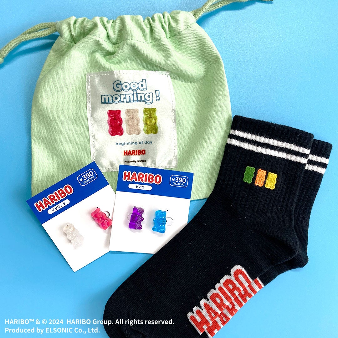 イヤリング&ピアスは左右で異なるカラーで、カラフルな「HARIBO」グミが目を引きます。