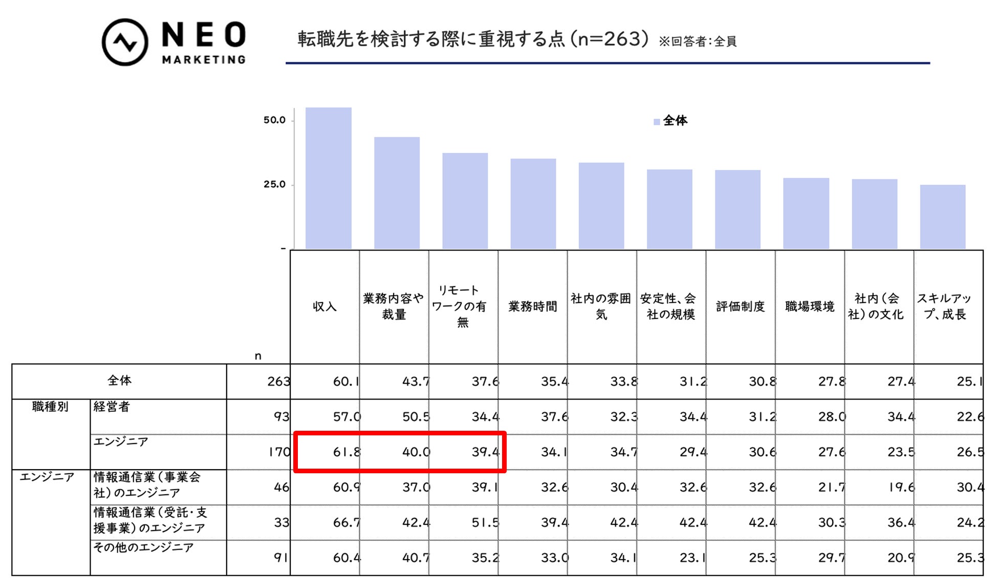全体では「収入」が60.1%で、「業務内容や裁量」が43.7%でした。