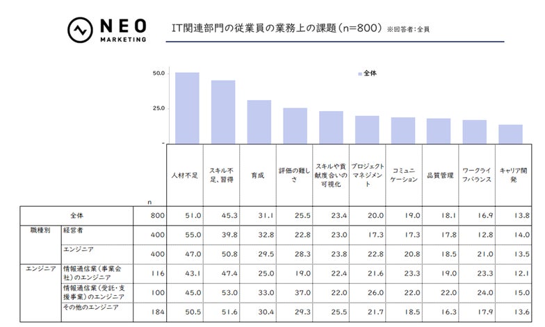 実際、「スキル不足、習得」「育成」「評価の難しさ」の回答が事業会社のエンジニアよりも高く、成果が可視化されにくいビジネスモデルの影響が読み取れます。