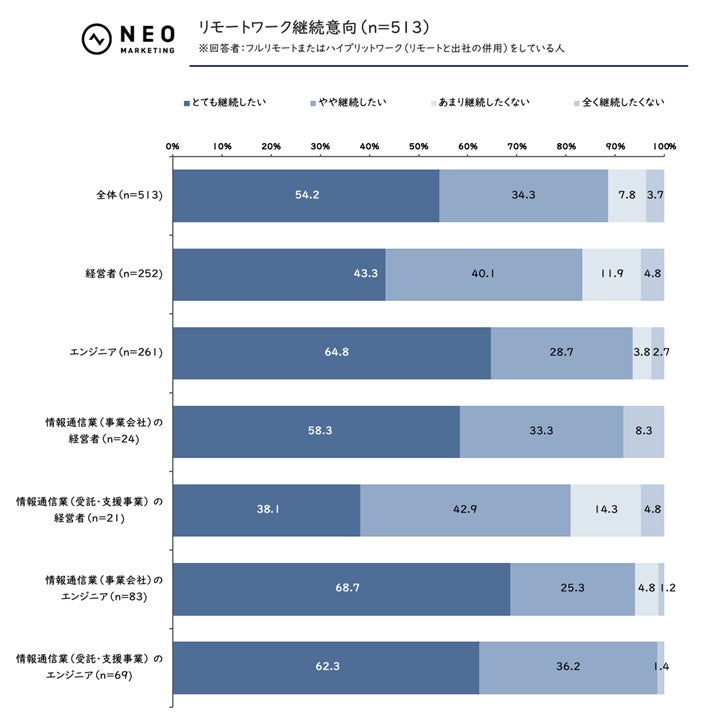 中でも「情報通信業(受託・支援事業)の従業員」は98.6%(※)と、ほぼ全員がリモートワークの継続を希望していました。