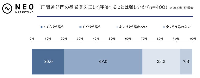 しかしながら、経営者側が過度に楽観視しているわけではなく、「IT関連部門の従業員を正しく評価することは難しいか」という設問では、69.0%(※)が難しさを感じていると回答。