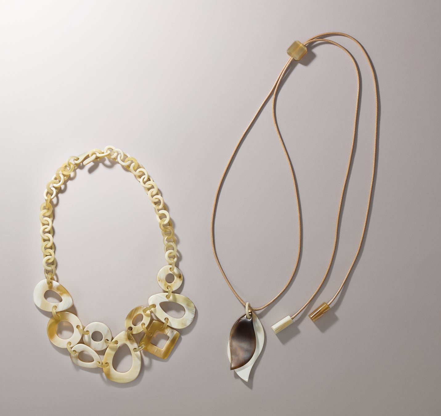 ニュアンスのあるやわらかな色みでオールシーズン使える水牛ジュエリーが登場。大ぶりなのに軽やかで、身に着けるだけで胸元を華やかに飾ります。
