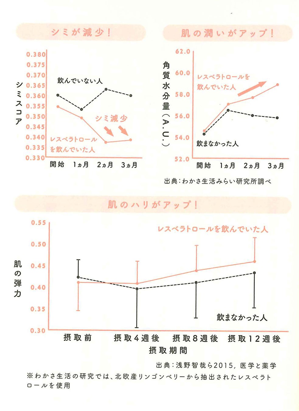 グラフでも結果が表れているように、レスベラトロールを飲んでいた人のほうが、徐々にシミスコアが下がり、潤いもアップしていることがわかります。また、肌の弾力もアップしています。