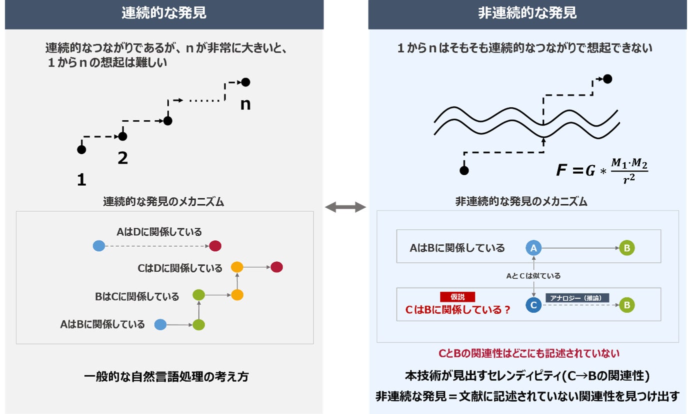 一般的な文献の検索や解析において、既知となる文献情報の抽出や求める情報に効率的にアクセスするための技術や方法論については研究が進んでいる一方で、既知の文献情報から記載のない未知の関連性を発見することは、未だ研究者自身の発想力や偶然に依存する形となっています。