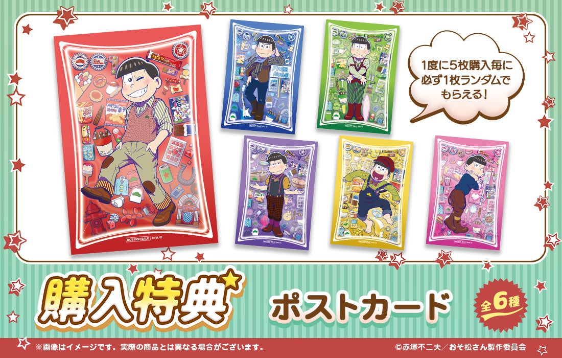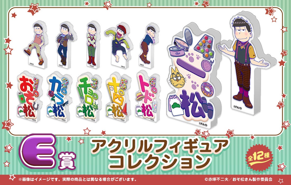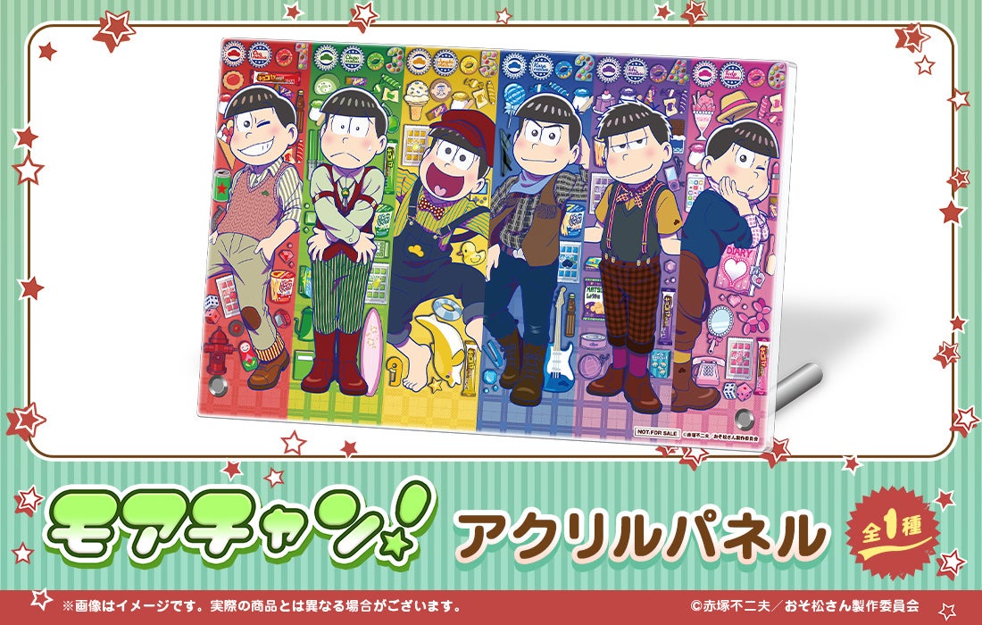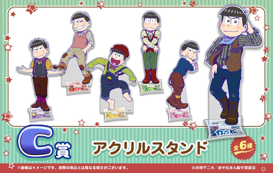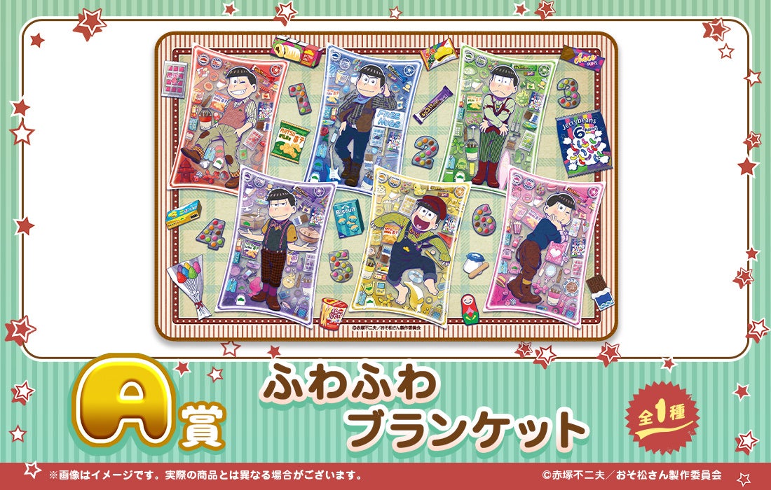 6つ子たちがレトロアメリカンな衣装を着て可愛い小物に囲まれた可愛さつめつめのイメージのもと、賞品が届く冬にちょうどいいブランケットやガチャ詰めができる可愛いマルチポーチ、コレクションの楽しいアクリルフィギュアやスマホなどに入るサイズのステッカーセットなど、全体的にポップで可愛いイメージにデザインされたグッズをラインナップ!