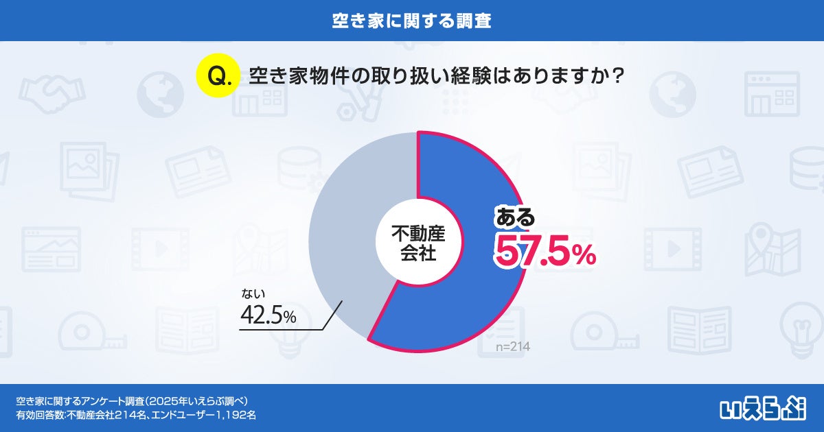 不動産会社に空き家物件の取り扱い経験について質問したところ、「ある」と回答した不動産会社は57.5%となり、全体の約6割が空き家物件を取り扱った経験があることが分かりました。