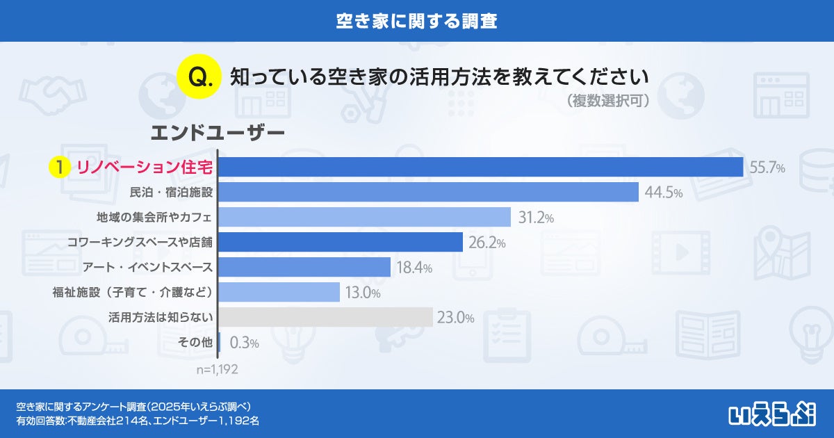 エンドユーザーに、知っている空き家の活用方法について質問したところ、「リノベーション住宅」が最多で55.7%となりました。他にも「民泊・宿泊施設」が44.5%、「地域の集会所やカフェ」が31.2%と続き、活用方法を「知らない」と回答した割合(23.0%)を上回る結果となりました。