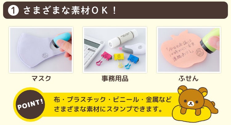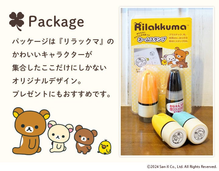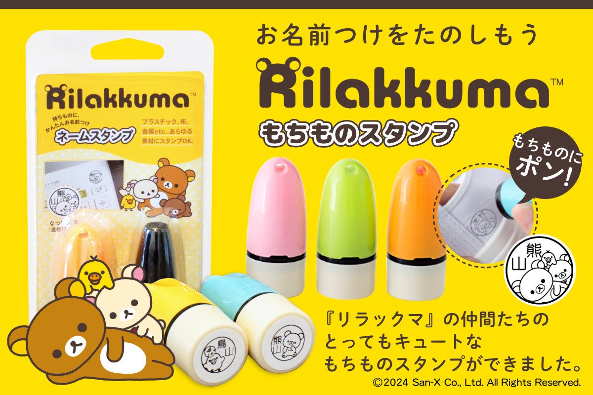 リラックマ、キイロイトリ、コリラックマ、チャイロイコグマなど、リラックマと仲間たちが子どものもちものの目じるしに。布やプラスチックなどあらゆる素材にポンポン押せる、とっても便利なスタンプです。