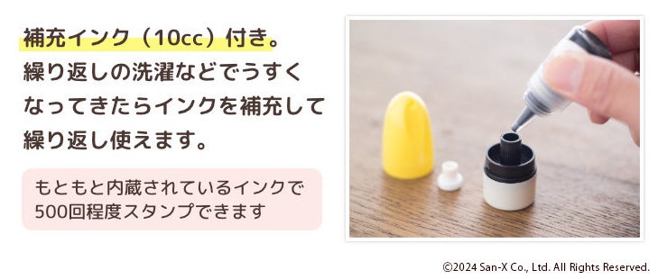 リラックマ好きにはたまらない、とってもかわいい専用パッケージに入れてお届け(10cc入り補充インク1本つき。1回の補充で500回程度のスタンプができます)。プレゼントにもぴったりです。