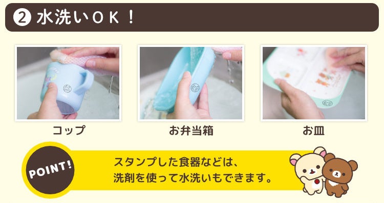 布やプラスチックなどあらゆる素材のもちものにスタンプできることはもちろん、耐水性インクを使っているため、洗濯や洗い物をしても落ちにくいのが特徴です。
